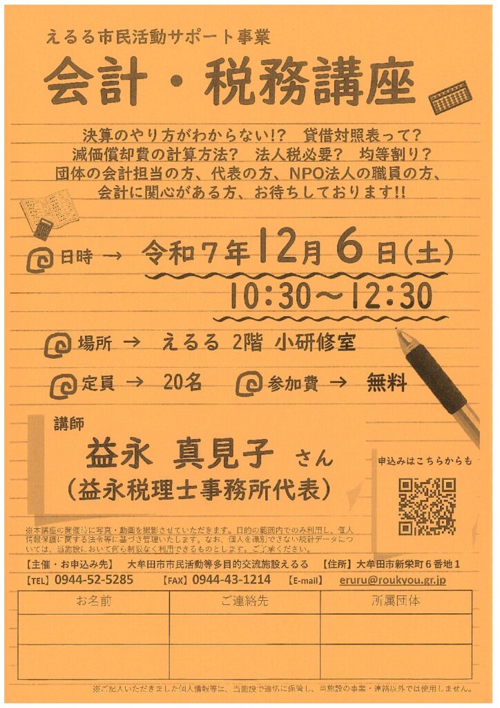 えるる市民活動サポート事業 会計・税務講座 決算のやり方がわからない!?貸借対照表って?減価償却費の計算方法?法人税必要?均等割り?団体の会計担当の方、代表の方…