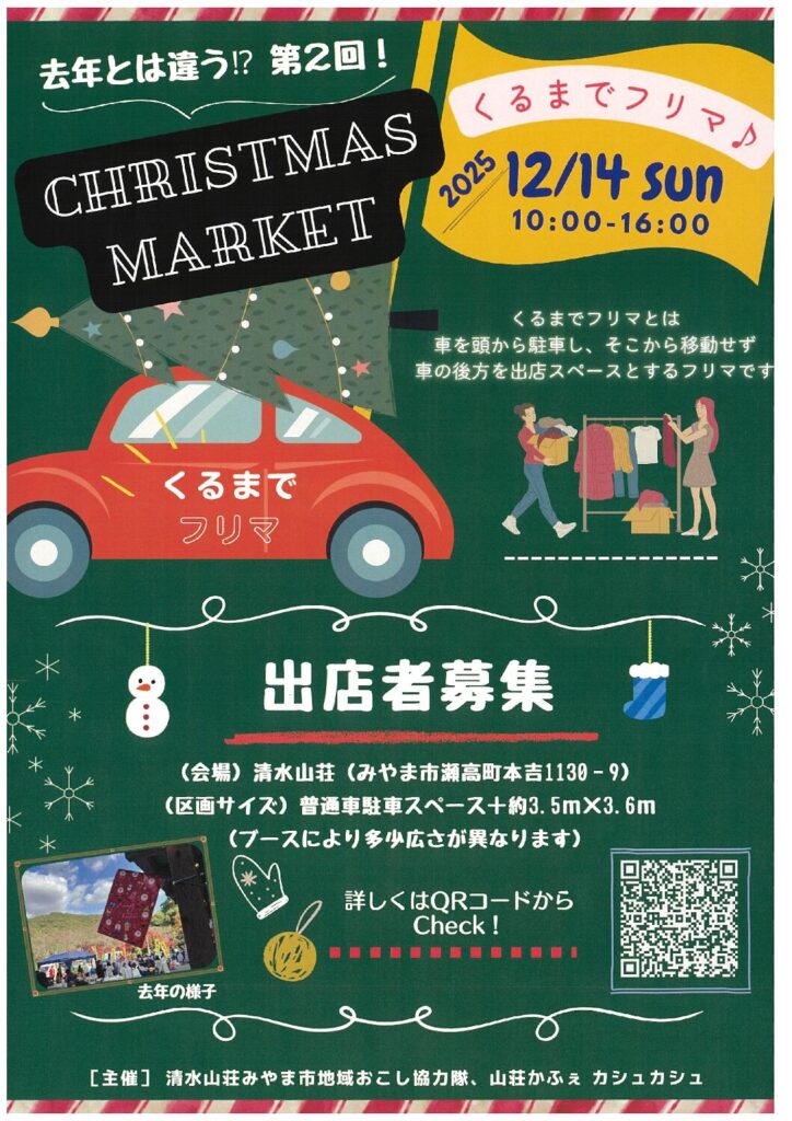 くるまでフリマ♪ 車を頭から駐車し、そこから移動せず車の広報を出店スペースとするフリマです! 出店者募集!! 【会場】清水山荘 【区画サイズ】 普…