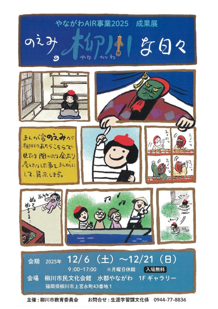 まんが家のみえが柳川のあちらこちらで見たり聞いたり会ったり考えたりした事をまんがにして展示します。